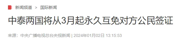 2、1月2日,中国与泰国共同官宣:3月1日起,中泰两国将实施永久互免签证入境政策。