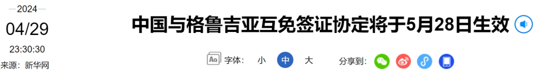 据新华社报道,中国驻格鲁吉亚大使馆4月29日消息,中国与格鲁吉亚关于互免持普通护照人员签证的协定将于5月28日生效。