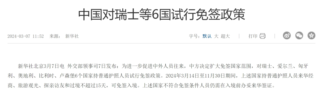 4、3月7日, 中国宣布:对瑞士、爱尔兰、匈牙利、奥地利、比利时、卢森堡6个国家持普通护照人员试行免签政策。