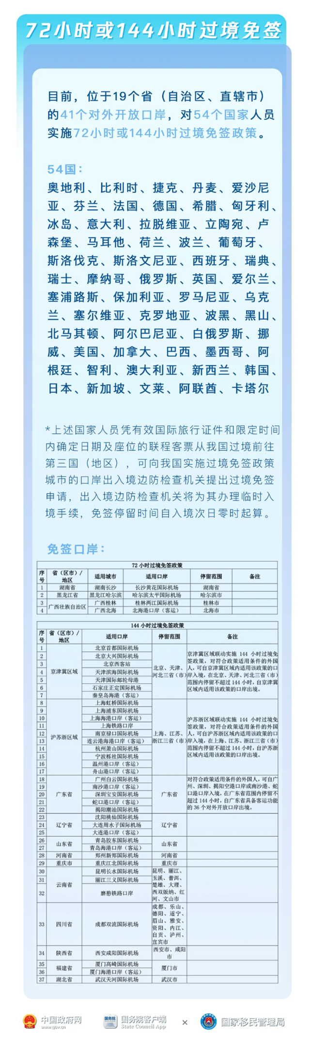 中国政府网消息,截至今年7月中旬,位于中国19个省区的41个对外开放口岸,也已针对54个国家人员实施72小时或144小时过境免签。