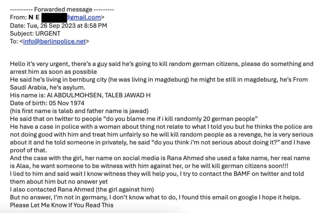 据德国媒体《世界报》的报道,他们设法与该女子取得了联系。她表示当时曾在示警邮件中写道:“ 您好,情况非常紧急,有一个人说他要无差别杀害德国公民,请尽快采取行动并逮捕他”,“他的名字是:Al ABDULMOHSEN, TALEB JAWAD H。出生日期:1974 年 11 月 5 日。” 电子邮件还列出了一些他的特征和说过的话。