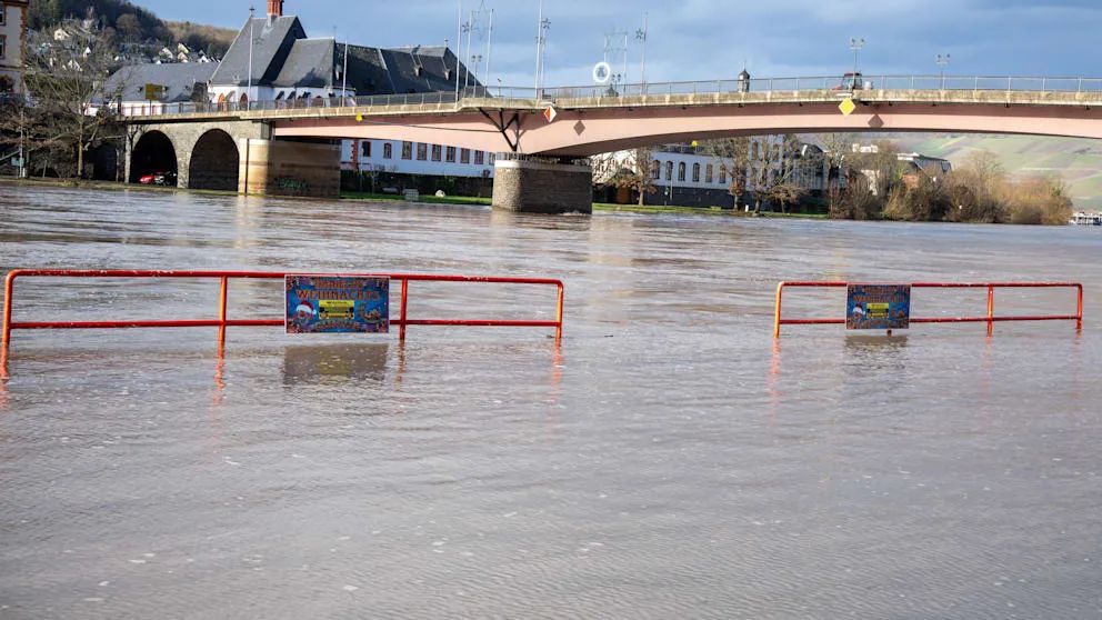 刚刚过去的周末,积雪的到来让许多人欣喜不已。然而,伴随着持续的大雨和因近期气温回升引发的积雪融化,莫泽尔河(Mosel)部分地区已出现河水泛滥的情况。据莱茵兰-普法尔茨州(Rheinland-Pfalz)洪水预报中心表示,科赫姆(Cochem)的水位预计将在周一至周二夜间达到峰值。