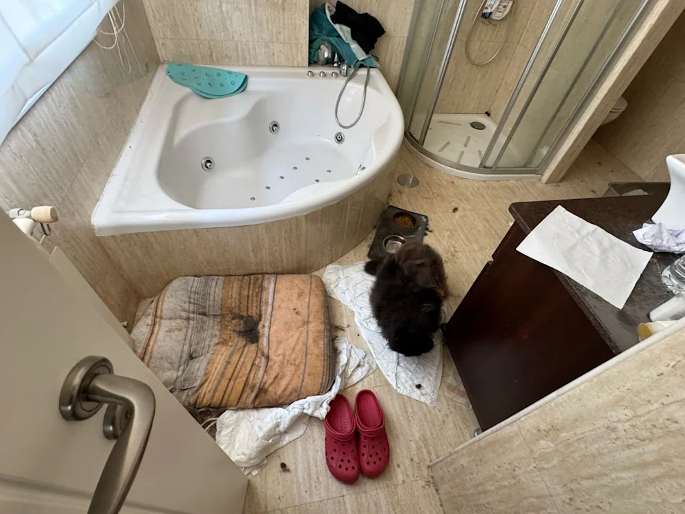 家里还有一只身患重病,憔悴不堪的猫住在厕所里。显然,这家人不敢出门去看兽医。