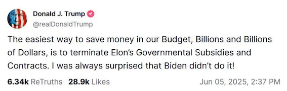 特朗普在他的短信服务平台“真相社交”(Truth Social)上写道,节省预算最简单的方法就是削减马斯克的政府补贴和合同。“我一直很惊讶拜登没有这么做,”他还在椭圆形办公室里表示,他曾为马斯克提供过很多帮助,但对他非常失望。“他对我评价很高,还没有针对我个人进行批评,但我相信接下来他会这么做。”