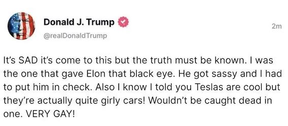 特朗普写道:“可悲啊,事情竟然发展到这一步,但必须说出真相。我就是那个把埃隆打成熊猫眼的人。他太嚣张了,我得让他清醒点。还有,我之前说特斯拉挺酷的,但其实那车挺娘的!我才不会开那玩意儿,太娘炮了!”