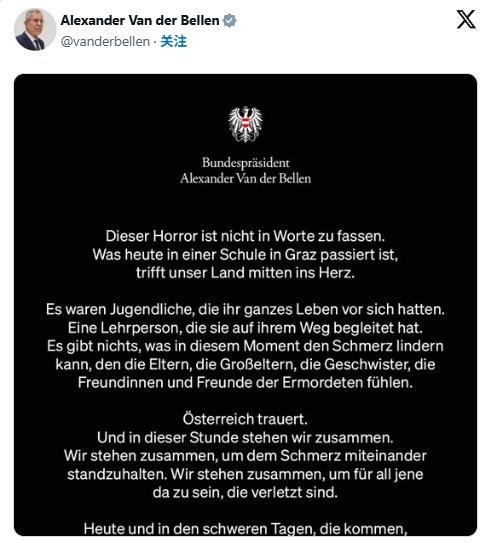 奥地利总统范德贝伦(Alexander Van der Bellen)也深感震惊,他在社交媒体上写道:“这种恐怖无法用言语表达,此刻,没有什么能够减轻父母、祖父母、兄弟姐妹和朋友的悲痛。奥地利举国上下沉浸在悲痛之中。”